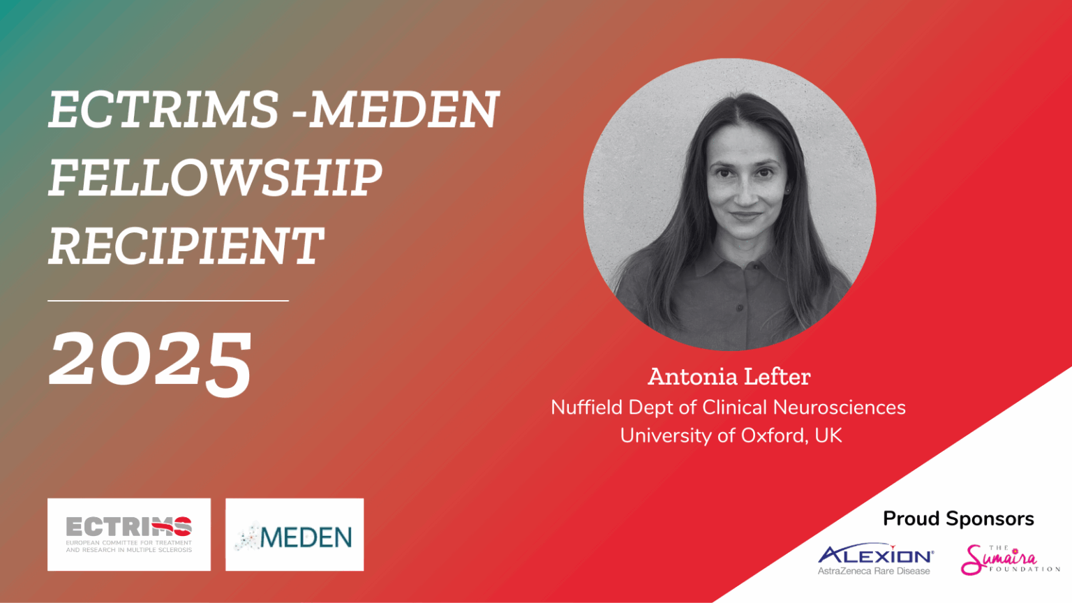 This joint fellowship is supported by The Sumaira Foundation and Alexion AstraZeneca Rare Disease. ECTRIMS initiatives are funded in part by financial contributions from industry and NPO partners. Contact secretariat@ectrims.eu for information about how to support this or other initiatives.